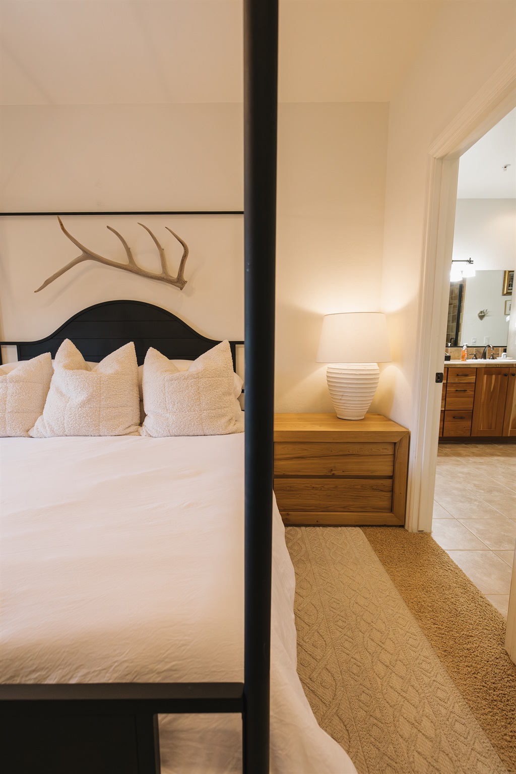 A serene primary suite designed for rest and retreat. Crisp white linens, plush textured pillows, and a statement four-poster bed create a cozy yet refined mountain feel. The private ensuite bathroom is just steps away, offering seamless comfort and conven