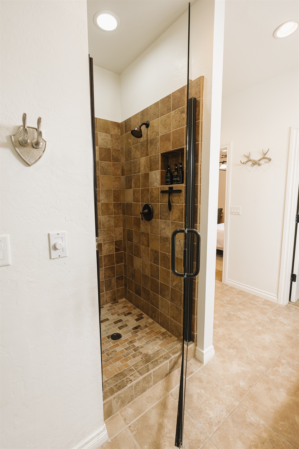 A warm, lodge-inspired bathroom with a double vanity, stone countertops, and soft ambient lighting. Thoughtfully styled with curated accents, plush towels, and premium fixtures, this spacious bathroom offers a calm, spa-like experience—perfect for slow mor