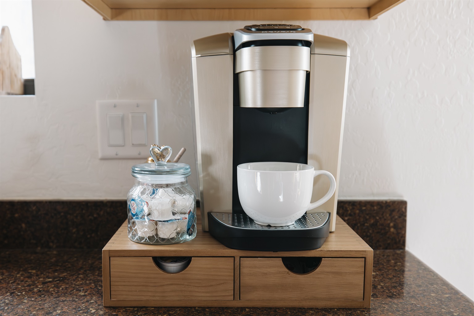 Morning coffee made easy with a Keurig coffee station—stocked with pods and mugs for cozy mountain mornings before skiing, hiking, or lake days in Pinetop.