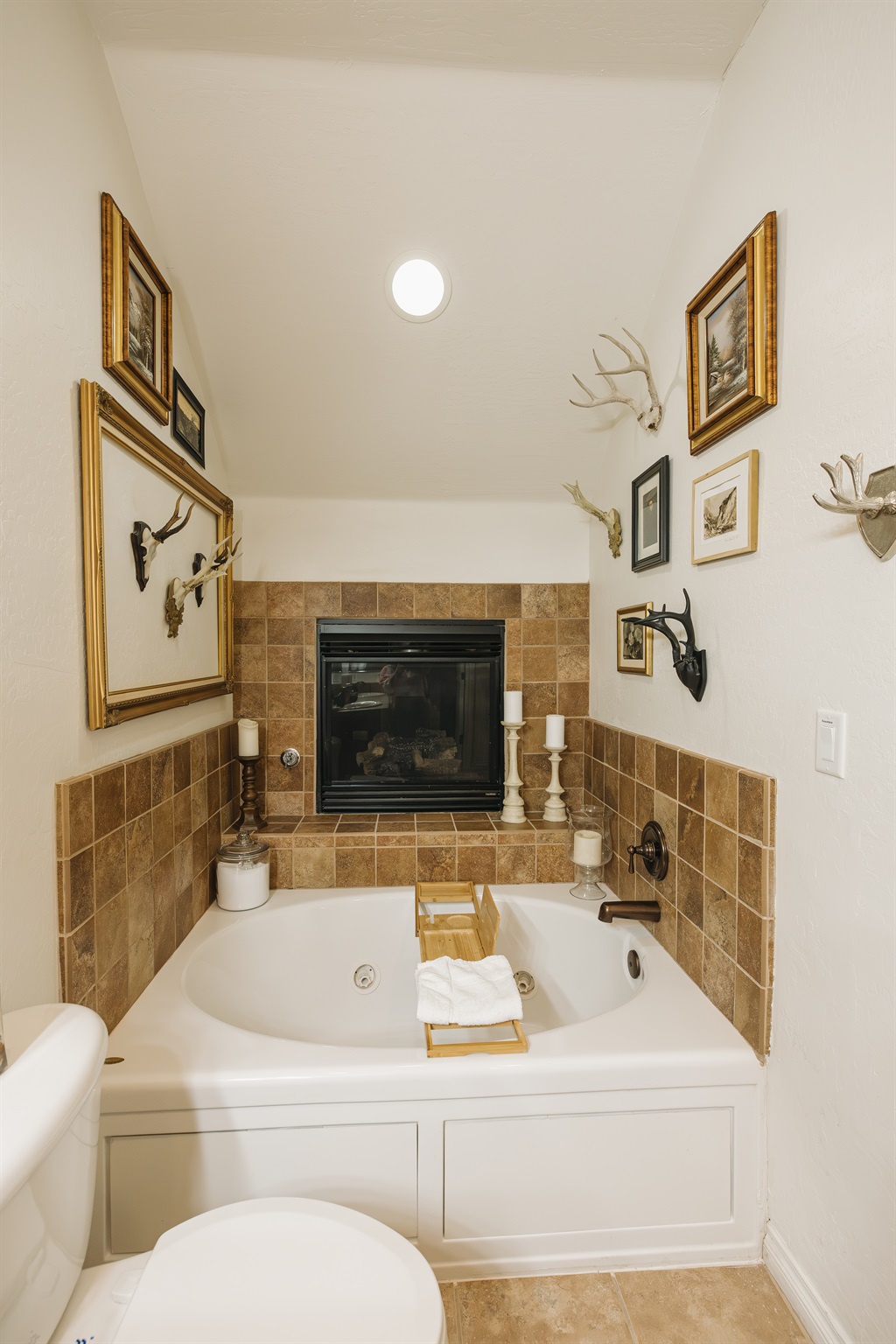 Soak beneath a glowing fireplace in this spa-like bathroom retreat. The deep jetted tub is framed by warm stone tile, curated vintage accents, plush towels, and soft lighting—creating a serene, romantic space to unwind after a day in the White Mountains.
