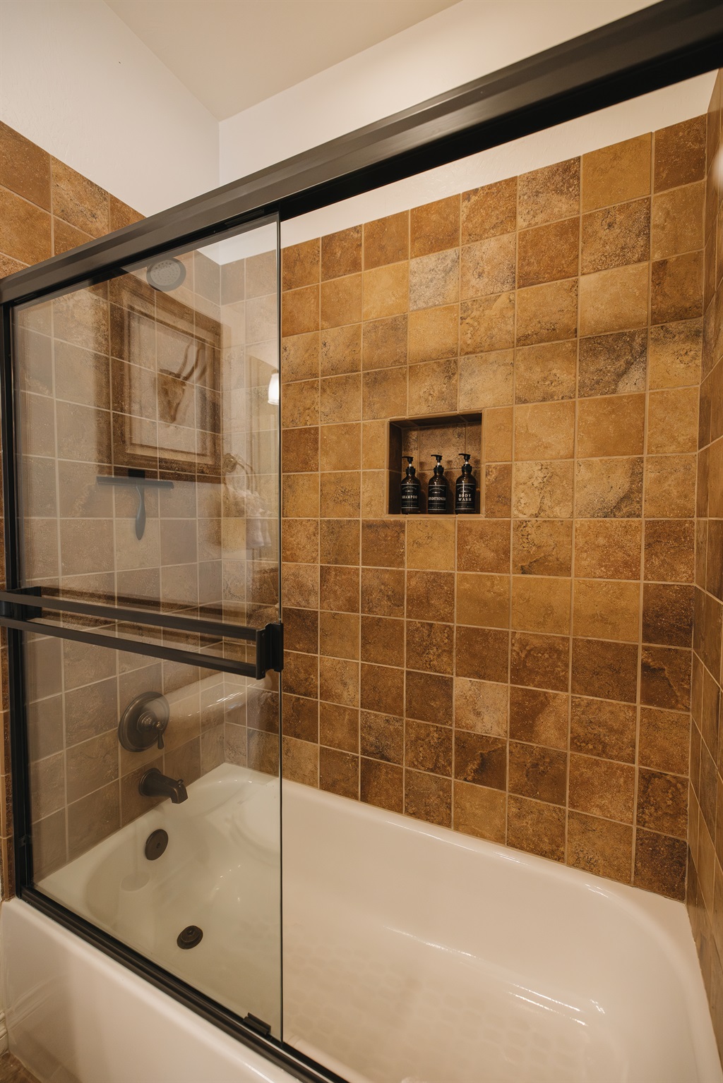 Clean, spa-inspired tub/shower combo with glass doors, warm tile, and built-in niche stocked with essentials—perfect for relaxing after skiing, hiking, or a day exploring the White Mountains.