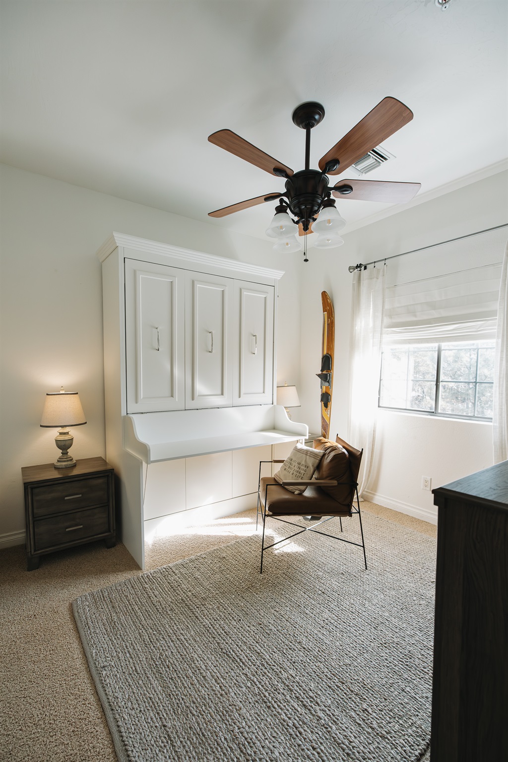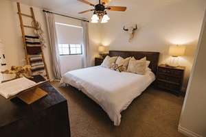 Calm, light-filled bedroom with ceiling fan, ample storage, and cozy reading chair—perfect for unpacking, working remotely, or enjoying a peaceful mountain getaway.