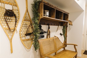 Welcoming entry with bench and storage for coats, boots, and ski gear. Designed for comfort and convenience, this cozy Pinetop condo is ideal for couples and families enjoying the White Mountains.