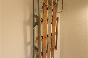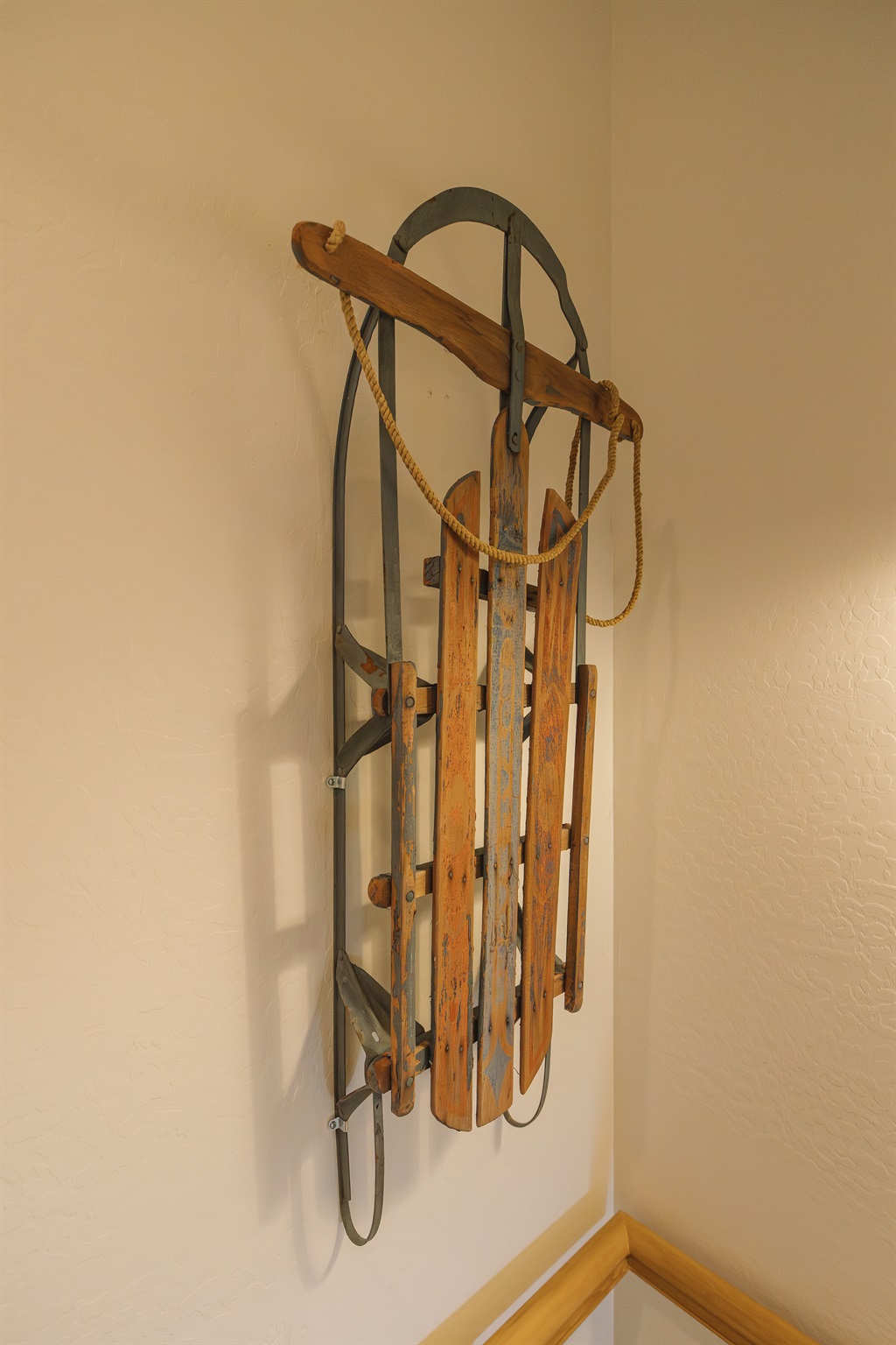 Vintage mountain sled wall art adds rustic charm and nostalgic cabin character—one of many thoughtful details that make this cozy White Mountains retreat feel warm, welcoming, and unforgettable.