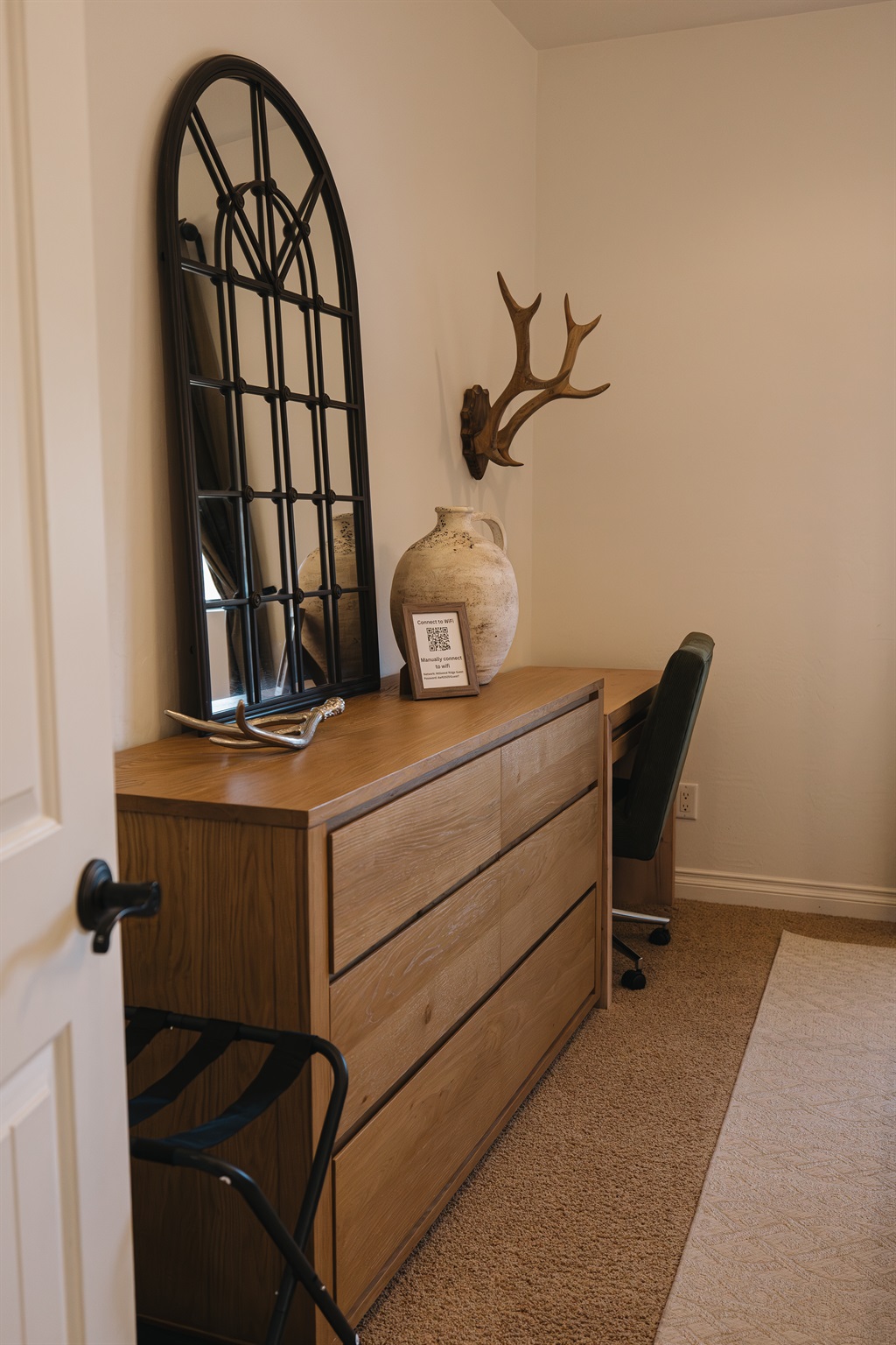 Quiet workspace with dresser storage, cozy desk chair, and warm cabin styling—perfect for remote work, journaling, or unwinding during your White Mountains getaway.