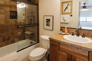 Warm, lodge-style bathroom with full vanity, glass-enclosed tub/shower, plush towels, and stocked essentials—perfect for refreshing after hiking, skiing, or a cozy night in.