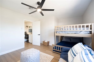 Bunk room with twin-over-full bed and pull-out sofa—perfect for families or extra guests
